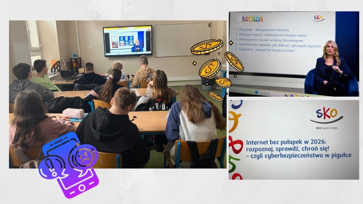 W dniu 13 lutego 2026 r. z okazji Dnia Bezpiecznego Internetu uczniowie klasy 6c wraz z wychowawcą Joanną Woźniczką wzięli udział w wyjątkowym spotkaniu online z panią Pauliną Krakowską, ekspertką ds. cyberbezpieczeństwa w PKO Banku Polskim. Spotkanie organizowane było w ramach programu SKO (Szkolne Kasy Oszczędności) realizowanego przez PKO Bank Polski.