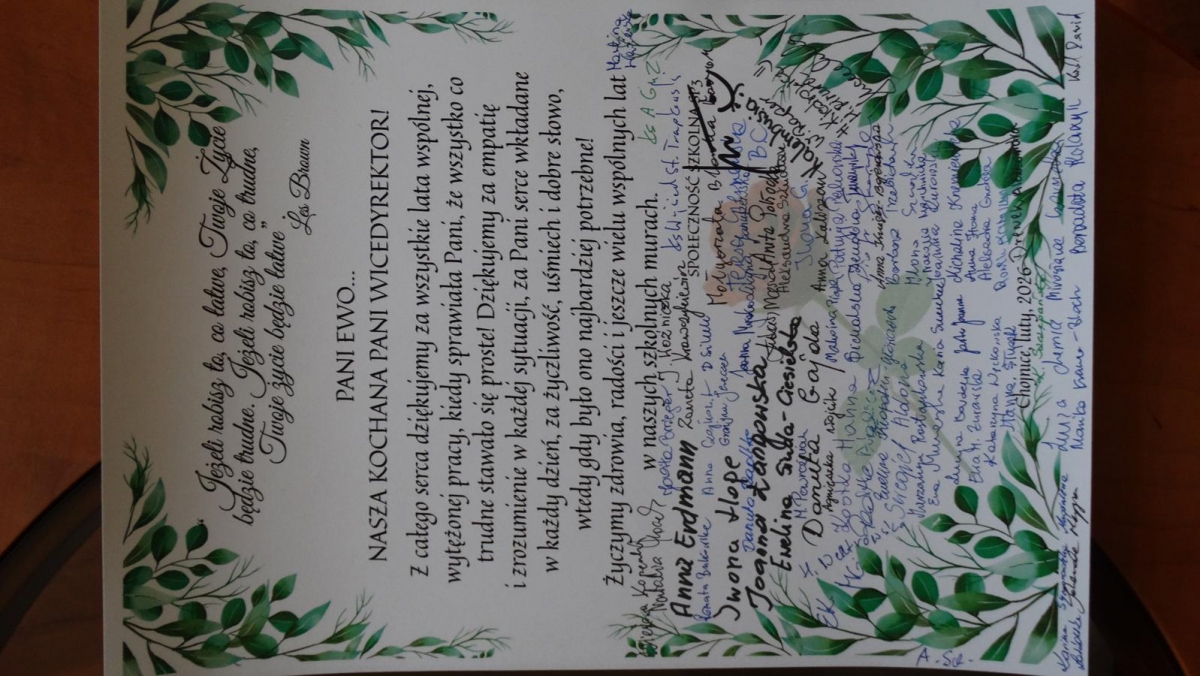 Przez lata pełnienia swojej funkcji dała się poznać nie tylko jako osoba bardzo kompetentna, zaangażowana i zorganizowana, lecz przede wszystkim życzliwa, empatyczna i pełna zrozumienia dla innych. Jako pracownicy dziękujemy serdecznie za każde dobre słowo, pomoc, zrozumienie, za uśmiech, otwartość, za trud codziennej pracy! Żegnamy panią Ewę jako wicedyrektor, cieszymy się jednak niezmiernie na kolejne lata wspólnej pracy w naszych szkolnych murach! Nasze uznanie wyrażaliśmy wczoraj na różne sposoby, starając się aby ten dzień stał się niezwykły i pełen wrażeń! Pani Ewo, jeszcze raz z głębi serca: DZIĘKUJEMY!